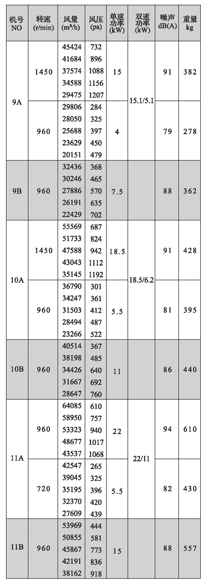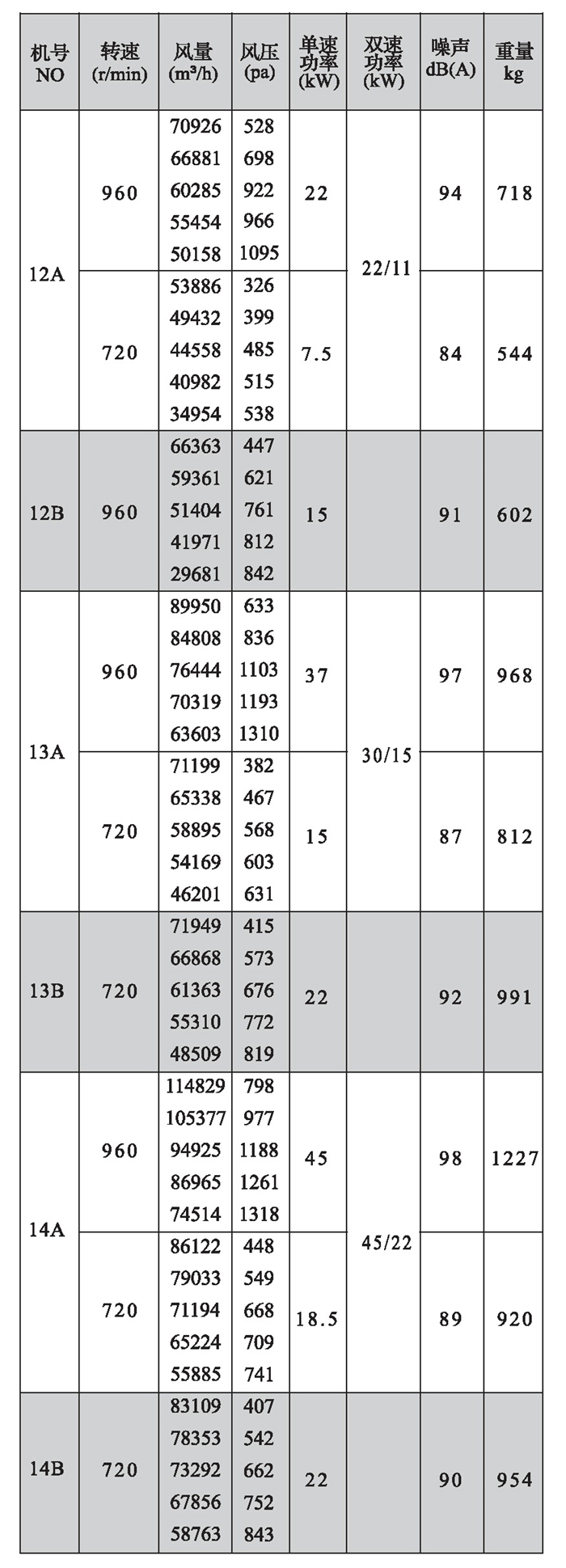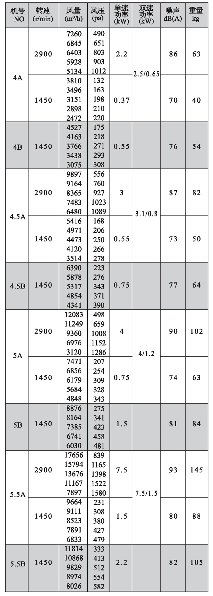 注:雙速風機重量參考同號中高速風機的重量。
